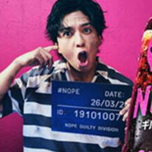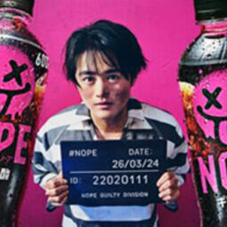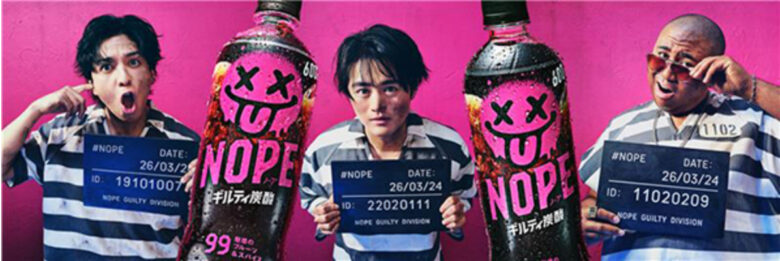 ギルティ炭酸「NOPE」のCMでは、出演者の胸に数字の“囚人番号”が付いています。